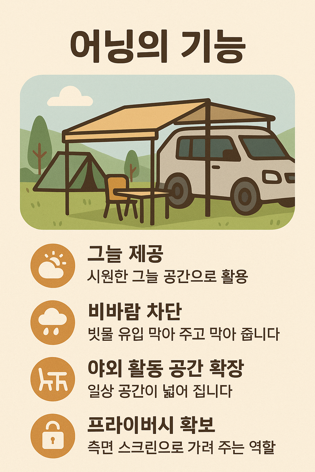 대표적으로 차량 측면이나 루프에 설치된 어닝을 펼치면 그늘진 공간이 생겨 요리, 휴식, 커피 타임 등 다양한 활동이 가능해지며, 마치 ‘야외 거실’을 꾸미는 느낌을 받을 수 있습니다.